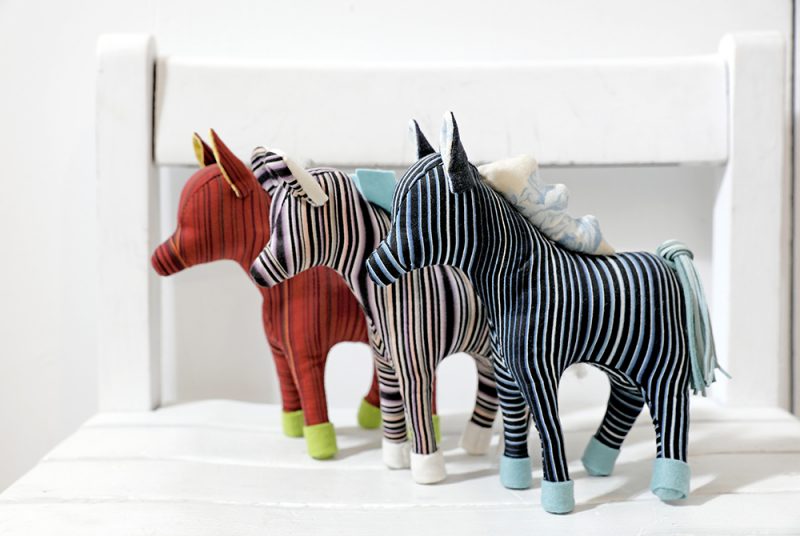 有趣的是,面對傳統棉布市場的萎縮,不被看好的夕陽產業,小倉織卻逆向操作,大力投注創立品牌「小倉縞縞」,而她最被讚許的即是將傳統手工藝機械化,降低成本以求普及;不但自己蓋工廠、活絡地方經濟,更異業結盟、擴大生產線,將小倉織廣泛應用在日常品項,試圖走出歷史刻板印象。例如與今治毛巾合作的小手帕,動物造型的擺飾等,從手工縫製的小馬身上,最能發現小倉織的鬼斧神工,不管是顏色選擇、條紋設計,漸層與間距都極具巧思,讓這尊小馬即使不具實用性,卻是最容易直接與人連結情感。
