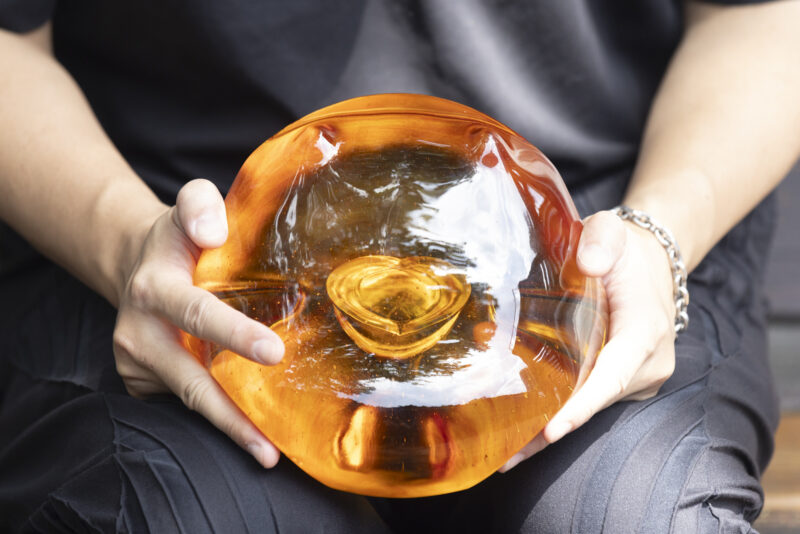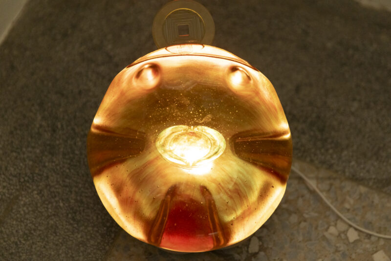 主體採用抗泛黃環氧樹脂,搭配木質底座與純手工裁切的香梨花壓花玻璃燈片。此批玻璃源自六〇至九〇年代的早期庫存,每片都帶有獨特的歲月痕跡,不僅耐看,更為空間增添淡雅的復古質感。燈座光線可調節至10個亮度段,從柔和的微光到明亮的強光,適合不同場景和情境的氛圍。